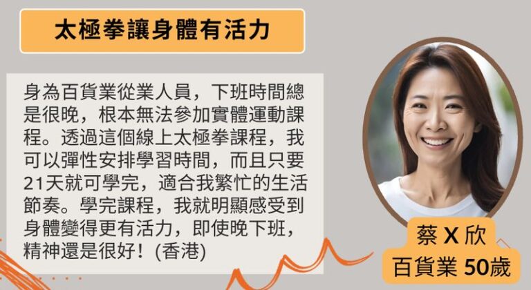 更重要的是,21天的學習時間契合心理學對於習慣養成的理論,研究表明持續21天的行為重複有助於將新技能內化為日常習慣。這意味著學員在完成課程後,不僅具備完整的太極拳技能,亦更易將太極拳納入日常生活,持續享有太極拳帶來的身心健康益處。